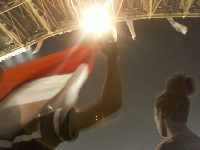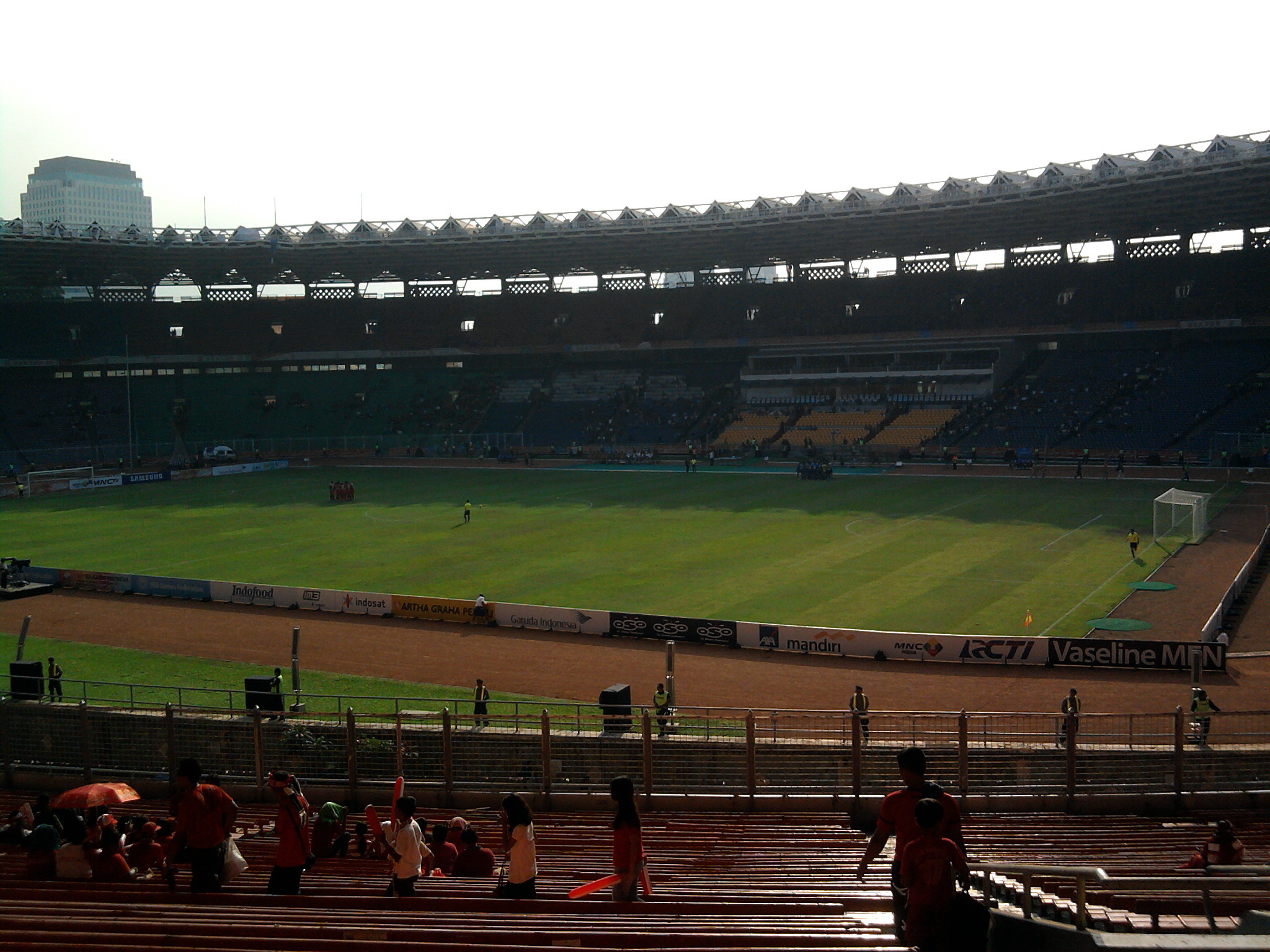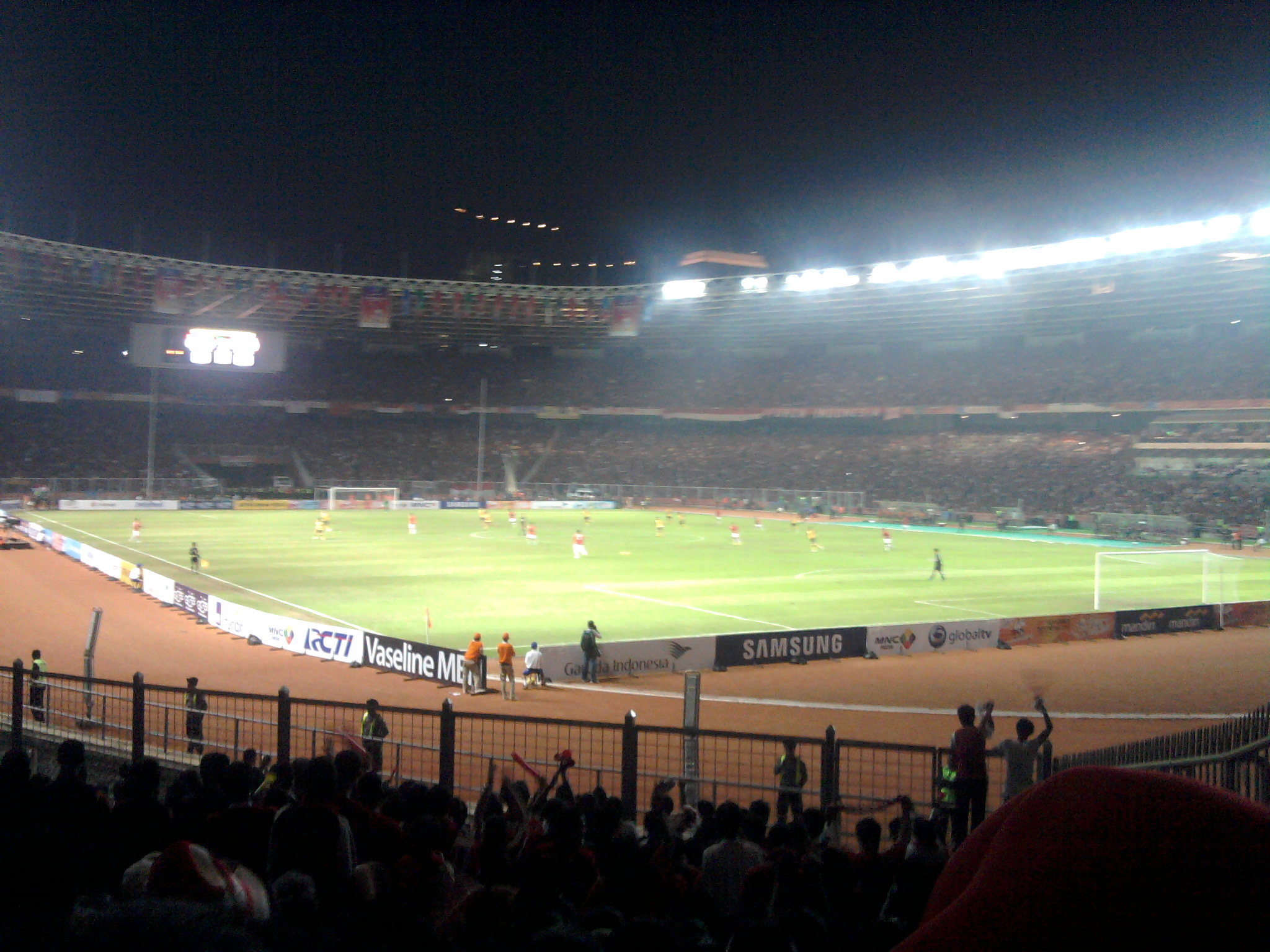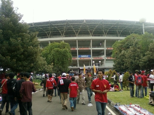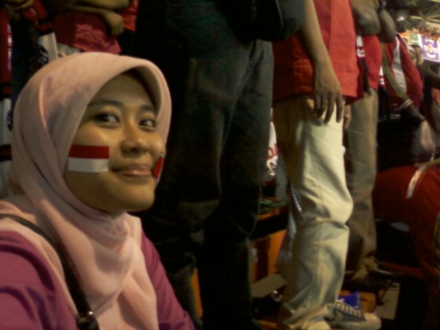 Kick off pertandingan Indo vs Malay jam 19.00, kami dapet tempat duduk di tribun kategori 2, gate 8-9, agak ke samping, deket pintu keluar, pikir kami waktu itu biar bisa gampang keluar. Ternyata keputusan ini keliru. Mending ya kalo nonton bola mending pilih di tengah, jangan deket gate, kalo bisa di depan-an deh.. Kalo ga VIP sekalian. Soalnya ntar pas udah kick off, banyak orang masuk gratisan, mereka memenuhi tempat kosong di sela-sela bangku. Dan kalo lagi riweuh bisa kedorong-dorong ke depan, ngeri-lah.. Kami aja pas pertandingan itu susah duduk, berkali-kali berdiri, dan berkali-kali kekusruk ke depan, hiks.. apalagi kalau lagi bolanya deket-deket gawang Malaysia, orang-orang pasti spontan berdiri dan.. uwoooo.. hebooh.