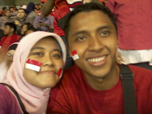 Suami yang saat itu baru dapet off dari kantornya, mengajak saya dengan antusias untuk menonton pertandingan itu. Katanya: Sekali-sekali buun.. kapan lagi nonton di GBK. Okelah, saya juga setuju dengan kata-kata suami saya, maklum kami berdua masih tipe pecicilan, suka coba sana coba sini, lompat sana lompat sini, mumpung masih muda, haha.. Kadang saya mikir, kapan ya saya dianggap pantes punya bayi sama Allah? Tingkah saya kadang masih mem-bocah gini, ngeliat temen-temen yang udah pada tekdung tu auranya beda gitu *eee.. maap curcol, hahaa*