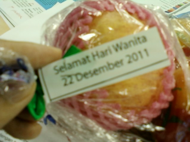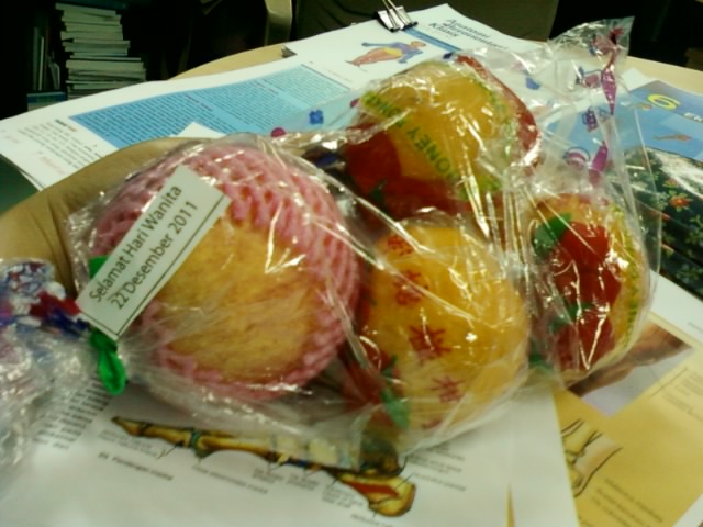 Isinya 3 buah Jeruk Ponkan dan Apel. Eh ternyata yang dikasi bingkisan ini cuma cecewe aja, haha.. yang karyawan cowo gigit jarii.. Kenapa kami dikasih ini? Karena 22 Des adalah hari Wanita, atau juga hari Ibu π