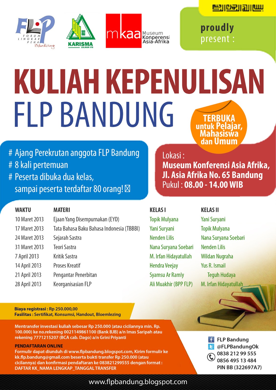Kuliah Kepenulisan ini diadain di Museum Asia Afrika. Udah 2x pertemuan dan saya baru ikut sekali. Menarik sih, saya jadi kaya kuliah lagi, hehe.. Dan harusnya ikut kuliah kepenulisan gini tu, ga cuma masuk materi juga kudu banyak praktek. Prakteknya itu lho yang belom aja, heuheu… Setidaknya saya praktek di blog sendiri deh, walopun bukan karya sastra nu baleg. *Ini nulis aja bahasa entah kemana, hahaha*