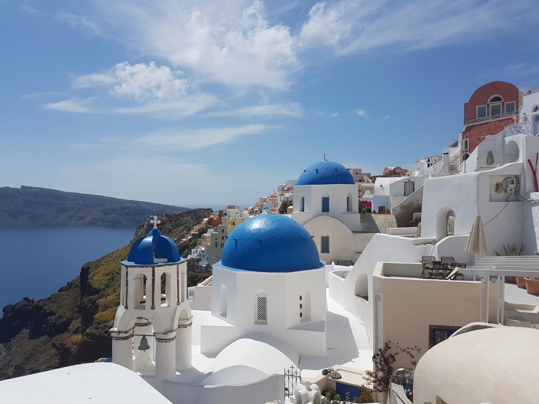 Ibu kota Santorini adalah Fira, bandaranya juga terletak di sana. Tapi tempat yang terkenal senagai daerah wisatanya adalah Oia. Di Oia, warna putih dan biru mendominasi. Bangunan-bangunannya terbuat dari semem bertumpuk-tumpuk, diselingi dengan tangga. Warna biru menemani warna putih yang mendominasi. Memberikan efek sejuk pada mata. Salah satu spot utama yang terkenal di Santorini. Tiga kubah biru, yang merupakan gereja. Spot tersebut menjadi incaran untuk berfoto.