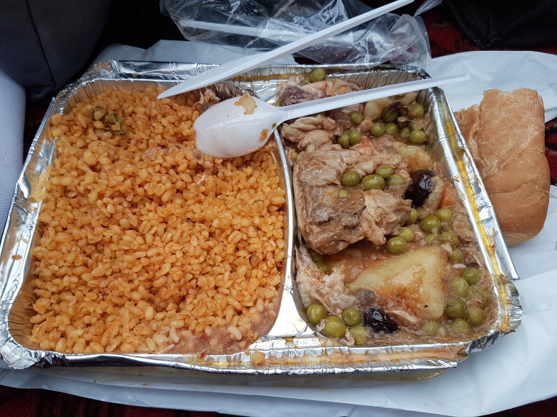 Pagi itu saya dapat rezeki, belum sempat jajan sarapan eh malah kawan sekamar saya, Mbak Vicka, membelikan saya bakso dari warung Indonesia. Lumayan untuk ganjel perut. Alhamdulillah. Sehabis sarapan, saya dan suami keluar penginapan, mau cari perbekalan untuk siang, sebelum jum’atan tiba. Eh ternyata di sekitaran jalan besar Aziziyah itu ada yang lagi bagi-bagi makanan kotakan. Ada antrian orang-orang untuk dapat makanan. Katanya itu ada orang kaya yang sedang sedekah di hari juma’at.