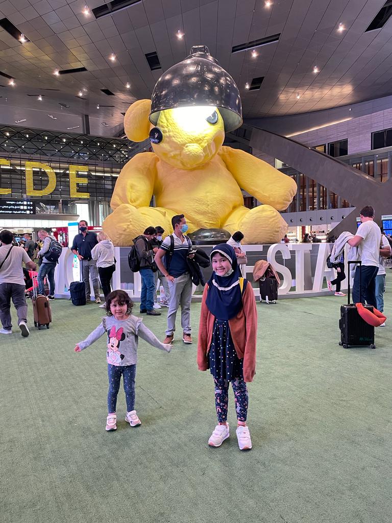 Bandara Hamad teh meuni Masya Allah ya gede pisan, luas, segala ada. Jadi inget pelem The Terminal-nya Tom Hanks. Kayaknya kalo hidup di airport itu gak kekurangan apa-apa. Kami transit dua jam aja. Lalu lanjut penerbangan Jakarta