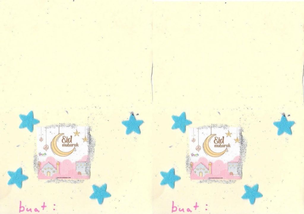 Ini program dari Pengajian Anak DeGromiest (Cek Instagram dan website DeGromiest). Sebelum lebaran, Alhamdulillah sempat mengadakan pengajian anak, dengan agenda: belajar praktek salat Id dan membuat kartu lebaran. Anak-anak belajar bagaimana salat Id yang takbirnya 7 kali di rakaat pertama dan 5 kali di rakaat kedua. Untuk membuat kartu lebaran, itu idenya Tante Aidina. Anak-anak membuat kreasi sendiri, lalu kartunya discan, supaya bisa diprint masing-masing. Nanti anak-anak bisa mengirimkan kartu lebaran ke teman-temannya. Waktu SD, saya juga dulu paling senang kalau bisa milih kartu lebaran lalu dikirimkan ke teman-teman. Soalnya kami kan juga gak ketemu pas libur lebaran, jadi saya dan teman-teman suka saling berkirim.