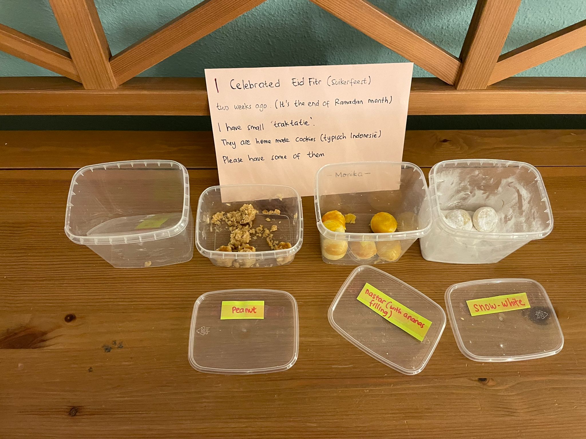 Ok, kembali pasca lebaran, di minggu kedua liburan Meivakantie, saya dan suami mengambil cuti seminggu. Kami berlibur ke Veluwee di Gelderland, liburan santai aja, ke alam, untuk recharge energi. Sekembalinya ke kantor, saya dan suami membawa kuker lebaran untuk dibagikan ke teman-teman kantor. Semoga menjadi jalan dakwah kami, meski ringan, tapi niat baiknya tersampaikan. Suami membawa satu kotak kue untuk bosnya dan rekan kerjanya yang dekat. Kalau saya, saya membawa beberapa kotak kue untuk disimpan di meja departmen saya, siapa saja boleh ambil.